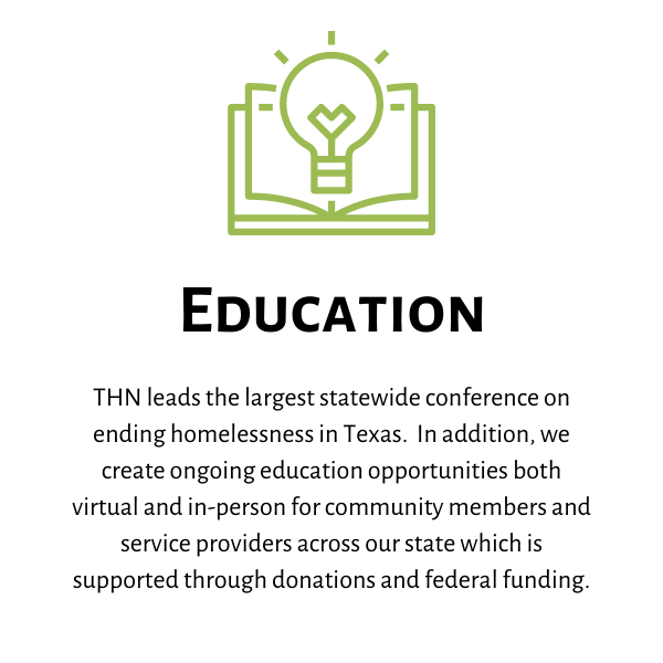 Texas Homeless Network (THN) is a non-profit membership-based organization helping communities strategically plan to prevent and end homelessness. THN works to end homelessness in Texas by collaborating with all communities, large and small, across the state to build systems to achieve this goal. We coordinate local and national advocacy efforts, data collection and research, host an annual statewide conference, and serve as the host agency for the Texas Balance of State Continuum of Care (CoC) where we assist in the coordination of programs and funding.