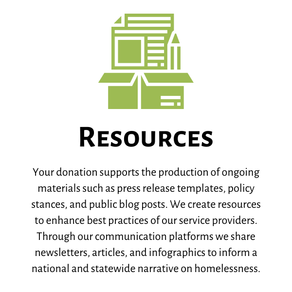 Advocacy: In 2021 we are launching an Advocacy Academy for people with lived experience of homelessness or housing insecurity, supporting intersectional legislation in the upcoming session, and fighting against discriminatory bills. We will continually monitor federal policies including things such as Equal Access for our LGBTQ unhoused neighbors and the Fair Housing Act. We will also launch a cross-sector coalition with agencies and organizations around the state to explore ways in which our work can strengthen through ongoing partnerships.